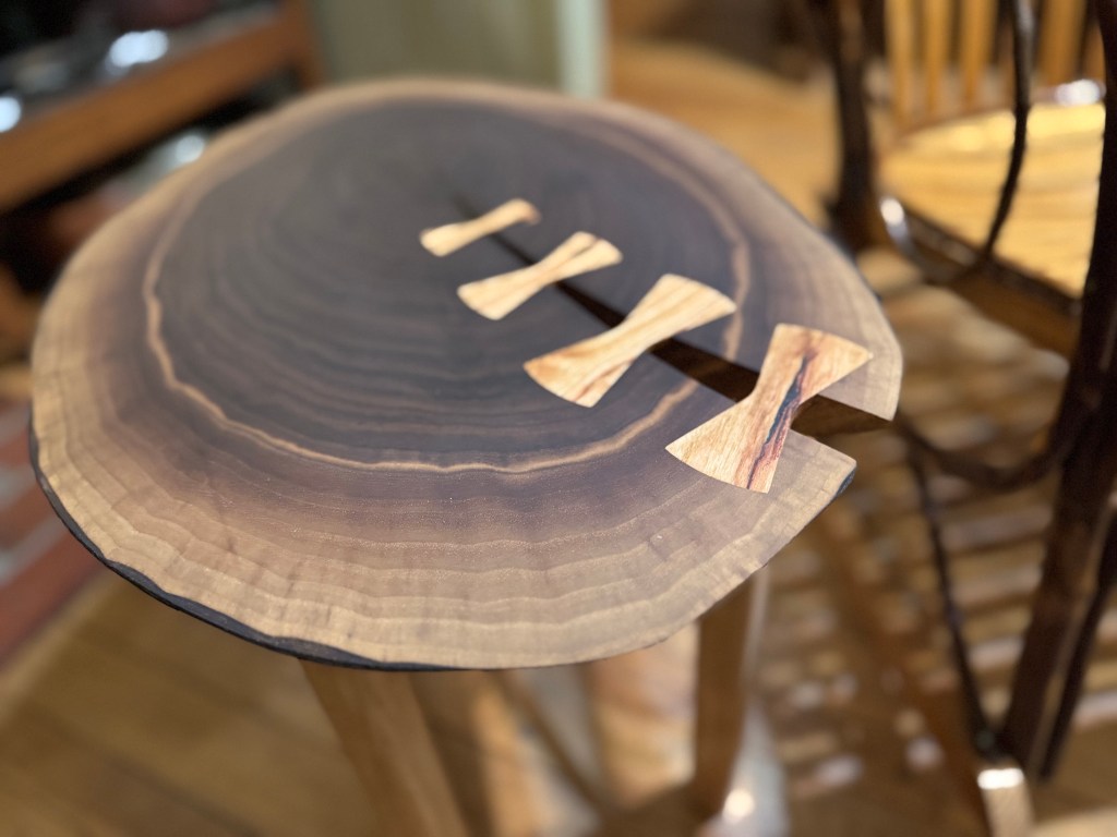 Black walnut side table with bow-tie inlays custom made to sit next to a twig rocking chair. Used 3D printed router template with 1/8th inch router bit with inlay bushings. Hickory legs and sugar maple twig stretchers.